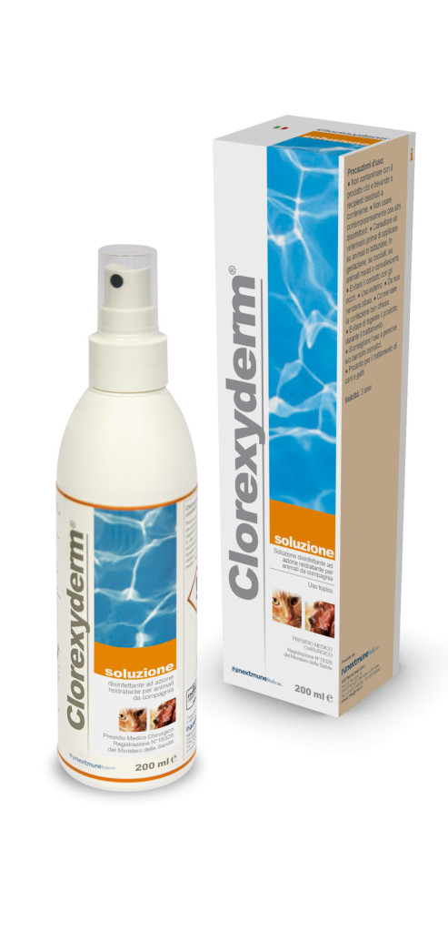 Fújjuk be a kezelendő bőrfelületet a Clorexyderm oldattal. Ne öblítsük le!