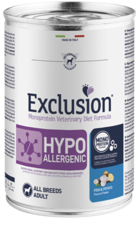 Az Exclusion Diet Hypoallergenic Fish and Potato egy teljesértékű diétás eledel felnőtt kutyák számára, melyet az összetevők és a tápanyag intollerancia csökkentésére fejlesztettek ki.